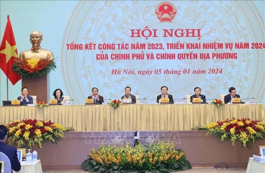 Phát biểu khai mạc Hội nghị, Thủ tướng Phạm Minh Chính bày tỏ vui mừng chào đón và cảm ơn các đồng chí lãnh đạo Đảng, Nhà nước, Mặt trận Tổ quốc Việt Nam; các ban, bộ, ngành, địa phương đã quan tâm, dành thời gian dự hội nghị. Đặc biệt, đồng chí Tổng Bí thư Nguyễn Phú Trọng, do điều kiện công tác chưa đến dự được, đã gửi lời chúc mừng đến Hội nghị về kết quả của năm 2023 cao hơn năm 2022 và giao nhiệm vụ cho Chính phủ không được chủ quan, thỏa mãn mà phải nỗ lực phấn đấu hơn nữa để năm 2024 lại có kết quả cao hơn năm 2023.