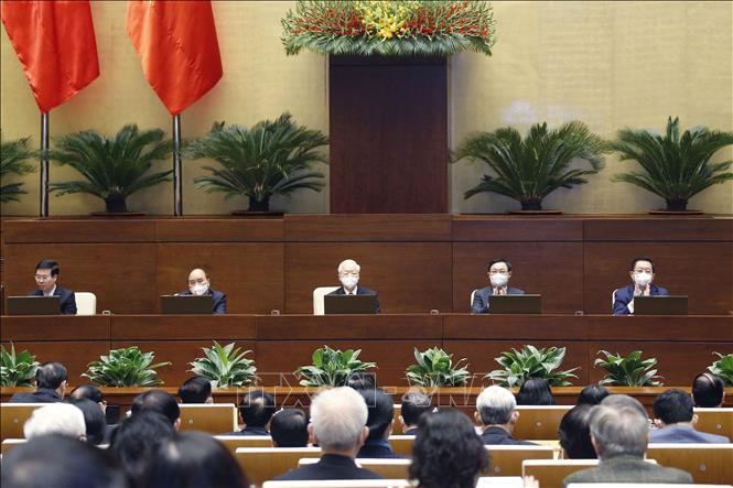 Tổng Bí thư Nguyễn Phú Trọng, Chủ tịch nước Nguyễn Xuân Phúc, Chủ tịch Quốc hội Vương Đình Huệ và các đồng chí lãnh đạo Đảng, Nhà nước dự Hội nghị. Ảnh: Doãn Tấn/TTXVN