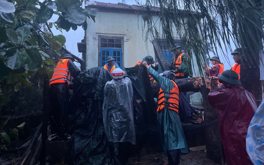 | Cán bộ, chiến sĩ Đồn Biên phòng Lăng Cô giúp dân khắc phục hậu quả do gió lốc |