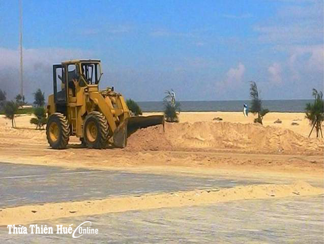 Tại thị trấn Thuận An, tuyến đường bê tông thuộc thôn Hải Thành dài khoảng 300m, bị cát bồi dày khoảng 0,3m. Nhiều xe ủi, nhân công đã được huy động cào cát, đảm bảo thông đường, tránh tình trạng cát xâm thực. Một số hộ dân phản ánh khi cải tạo tuyến đường ven biển, số cát dôi dư sau khi đã tái tạo lại mặt bằng, UBND thị trấn Thuận An không đưa vào bãi tập kết gần đó mà chở đi khỏi địa bàn. Người dân nghi ngờ có chuyện lợi dụng cải tạo đường để bán cát biển. “Nhiều ngày nay thấy xe chở cát ra khỏi bãi cả mấy chục chiếc, chạy vào mấy thôn trong thị trấn mà không biết bán hay cho người khác san lấp mặt bằng?!”, bà M., một hộ bán nước giải khát gần bãi biển Thuận An bày tỏ.