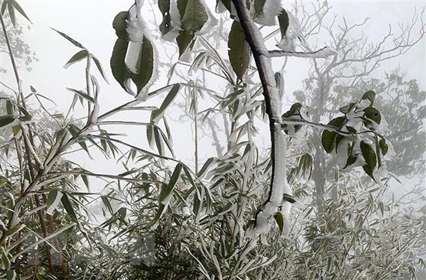Băng giá, sương muối phủ trắng cây cỏ đường đi, cây rừng thuộc vườn quốc gia Hoàng Liên khu vực cáp treo đường lên đỉnh Fansipan. Ảnh: Quốc Khánh/TTXVN