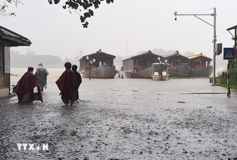 | Lũ lên trên báo động 2 gây ngập ven bờ Nam sông Hương, thành phố Huế. (Ảnh: Nguyên Lý/TTXVN) |