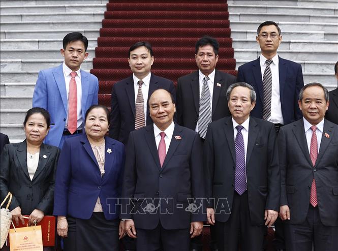 Chủ tịch nước Nguyễn Xuân Phúc và đồng chí Sisay Leudetmounsone chụp ảnh chung với các đại biểu. Ảnh: Thống Nhất/TTXVN