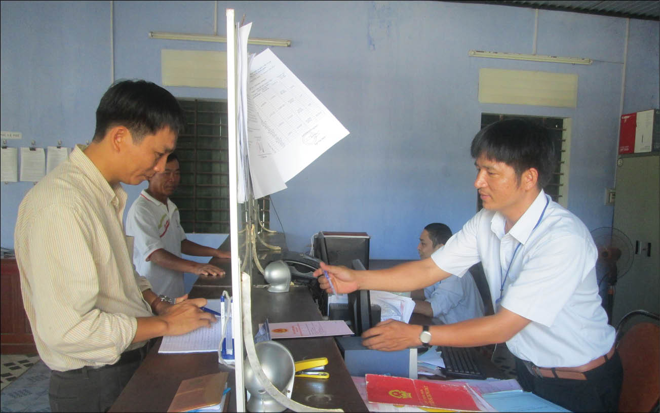 Các thành viên có chung quyền sử dụng đất, tài sản gắn liền với đất sẽ được ghi tên vào thẻ đỏ kể từ ngày 5/12. (Trong ảnh: trả kết quả cấp thẻ đỏ tại bộ phận một cửa huyện Quảng Điền)