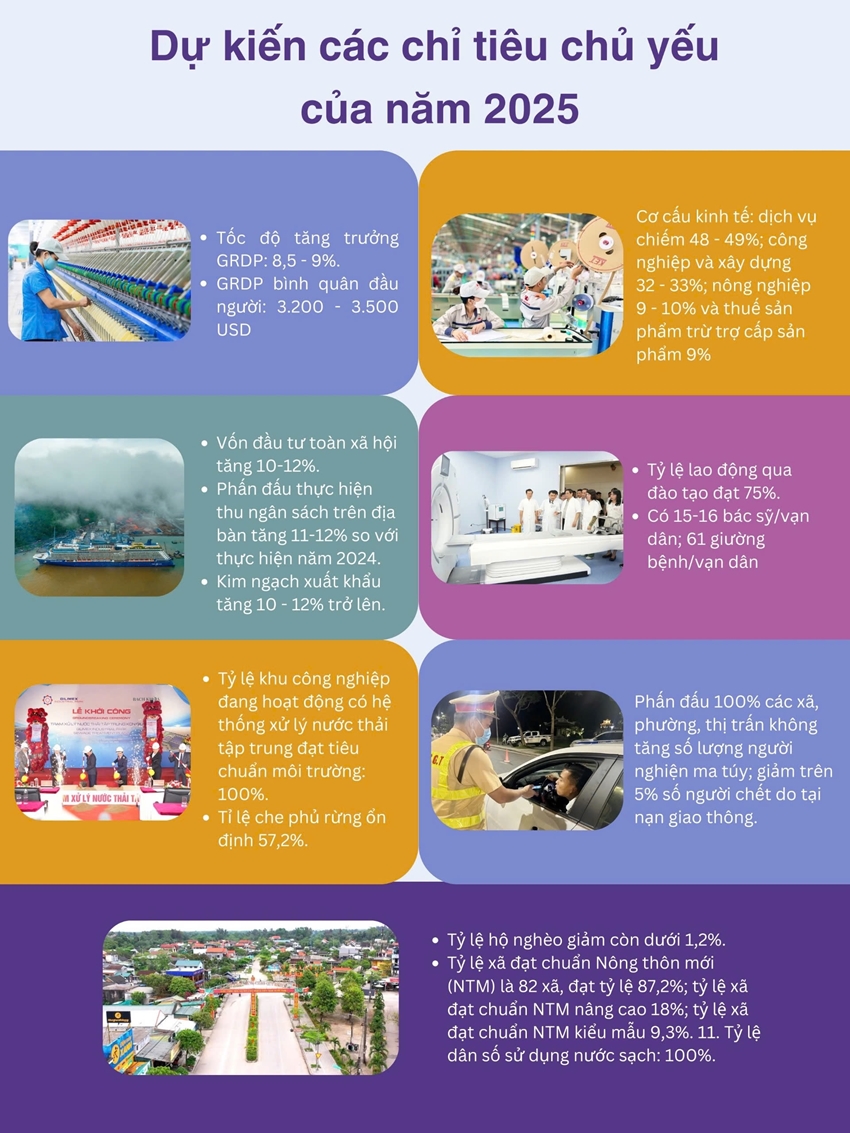 Với các chỉ tiêu chủ yếu dự kiến của năm 2025, đáng chú ý là tốc độ tăng trưởng GRDP đạt từ 8,5 - 9%. GRDP bình quân đầu người từ 3.200 - 3.500 USD. Về cơ cấu kinh tế, dịch vụ chiếm 48 - 49%, công nghiệp và xây dựng 32 - 33%, nông nghiệp 9 - 10% và thuế sản phẩm trừ trợ cấp sản phẩm 9%...