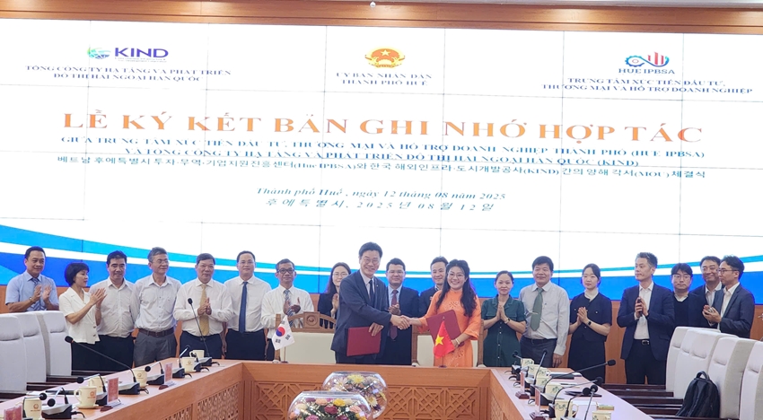 HNN.VN - Ngày 12/8, Trung tâm Xúc tiến đầu tư, thương mại và Hỗ trợ doanh nghiệp thành phố Huế (Hue IPBSA) và Tổng công ty Hạ tầng và Phát triển đô thị Hải ngoại Hàn Quốc (KIND) đã ký kết bản ghi nhớ hợp tác, đánh dấu một cột mốc quan trọng trong việc phát triển quan hệ đối tác tại thành phố Huế. Tham dự lễ ký kết có ông Hoàng Hải Minh, Phó Chủ tịch UBND thành phố; về phía KIND có ông Bokhwan Kim, Tổng Giám đốc KIND.