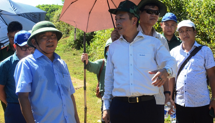 | Phó Chủ tịch UBND tỉnh Phan Quý Phương kiểm tra một hầm được người dân đào để khai thác vàng trái phép để lại |