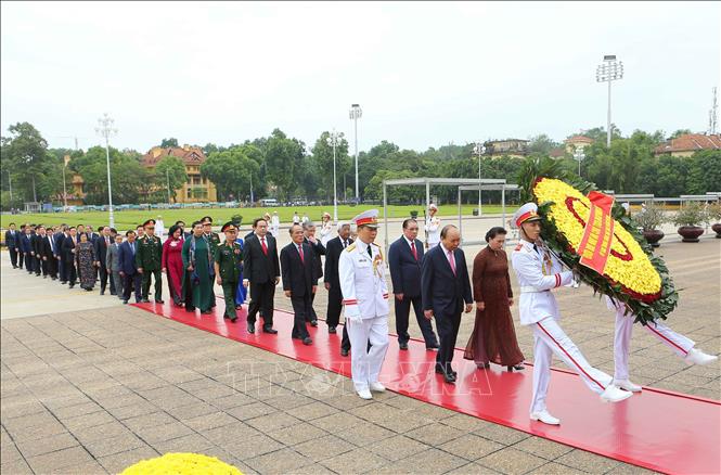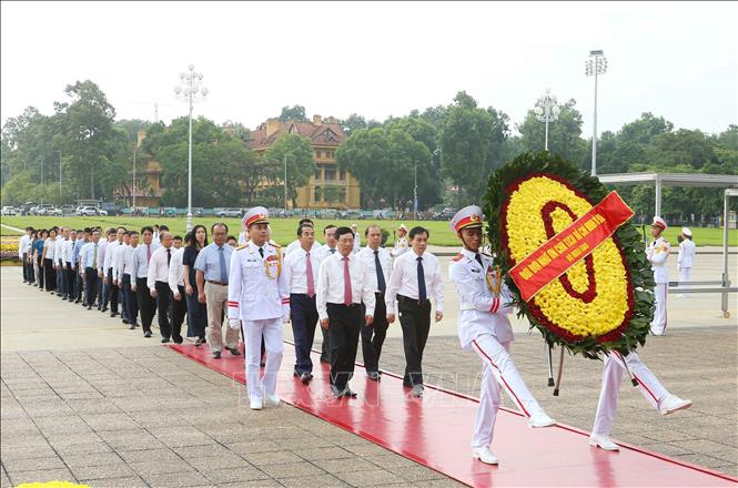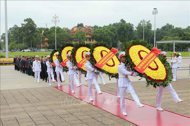 Đoàn đại biểu Ban Chấp hành Trung ương Đảng, Quốc hội, Chủ tịch nước, Chính phủ, Ủy ban Trung ương Mặt trận Tổ quốc Việt Nam đặt vòng hoa, vào Lăng viếng Chủ tịch Hồ Chí Minh. Ảnh: Doãn Tấn/TTXVN