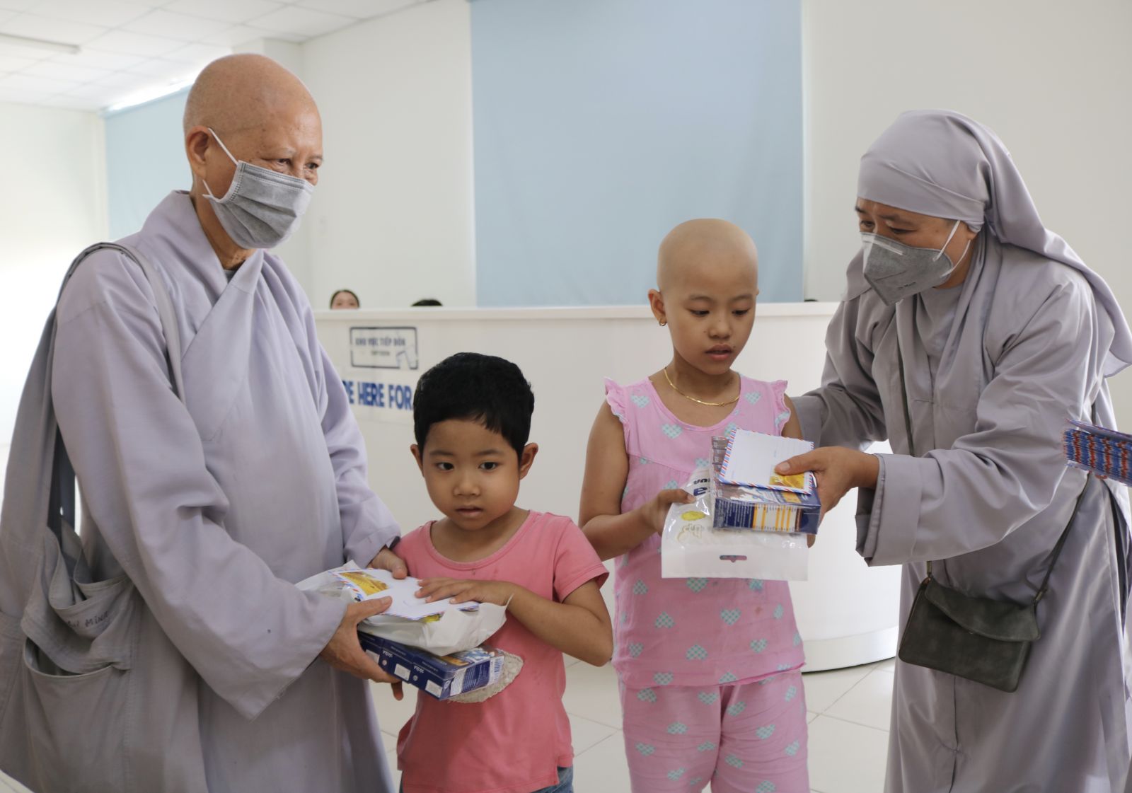 Hơn 700 phần quà gồm sữa, thực phẩm và tiền mặt trị giá từ 200 - 500 nghìn đồng/suất được các ni sư trao tận tay cho bệnh nhi, bệnh nhân đang điều trị tại Khoa Ung bướu, Trung tâm Huyết học…