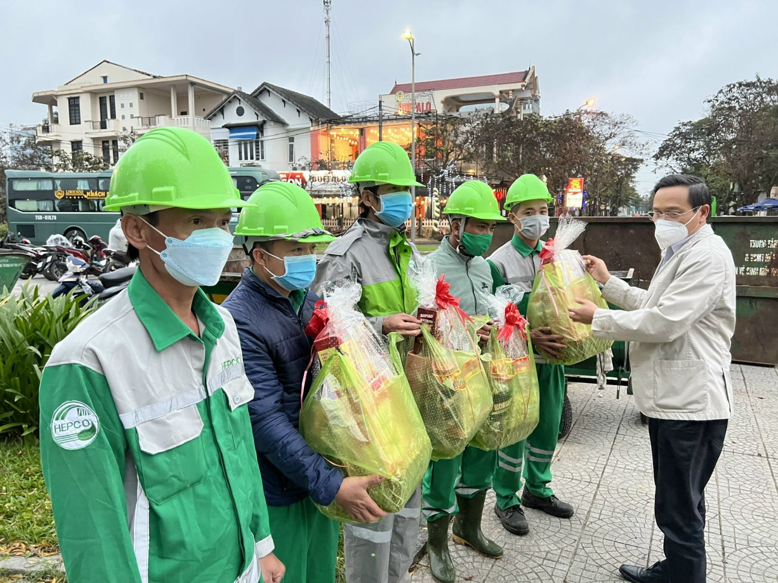 Đến thăm các công nhân Công ty CP Môi trường và Công trình đô thị Huế tại hiện trường, ông Nguyễn Quang Tuấn gửi lời chúc mừng năm mới đến người lao động và đề nghị công nhân của Công ty tập trung chỉnh trang đô thị, vệ sinh, dọn dẹp đường phố, tổ chức thu gom rác thải tại các tuyến đường, bảo đảm vệ sinh môi trường trước, trong và sau Tết để thành phố sáng – xanh – sạch – đẹp, phục vụ nhân dân vui xuân, đón tết.