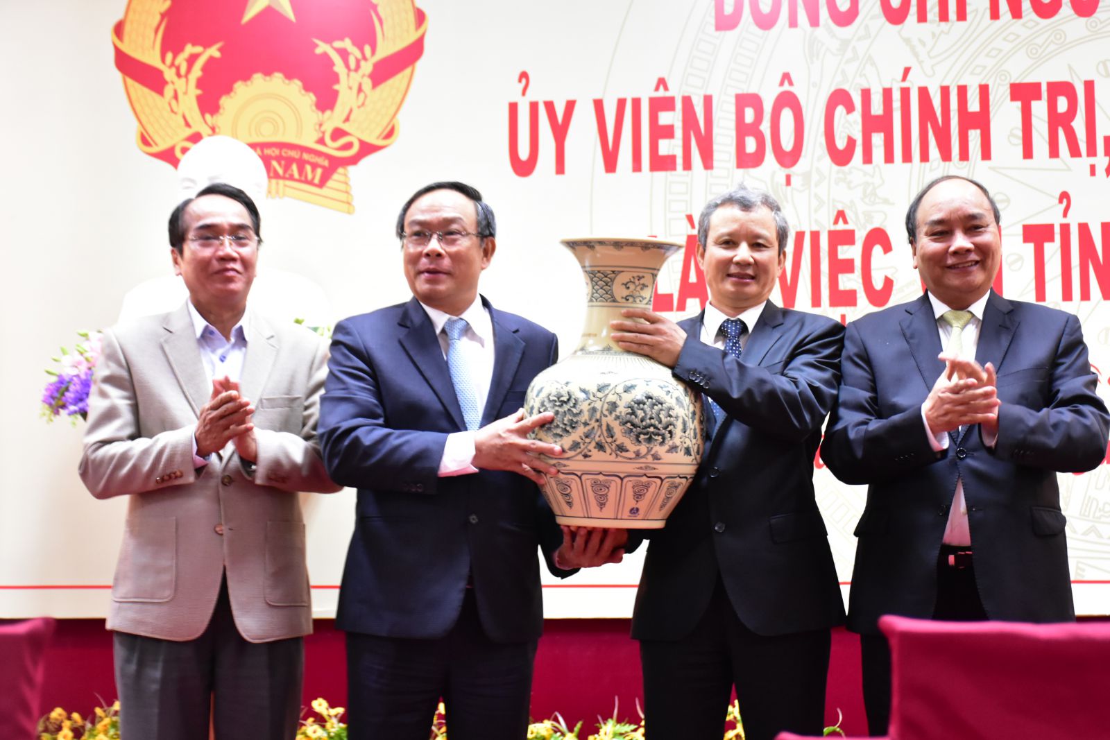 Thủ tướng tặng lãnh đạo tỉnh quà lưu niệm với mong muốn phát huy tinh thần dân chủ, đoàn kết, thống nhất, hoàn thành nhiệm vụ kinh tế- xã hội năm 2018