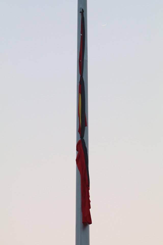 Quốc kỳ dần được kéo lên trong nền nhạc Quốc Ca. Lá cờ rủ được treo lên đến điểm 2/3 cột cờ thay vì treo cao như ngày thường.