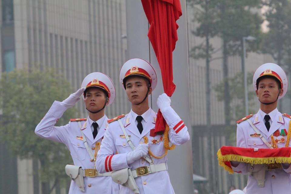 Khi Quốc ca bắt đầu, người dân ở Quảng trường Ba Đình cũng đứng nghiêm thực hiện lễ chào cờ.