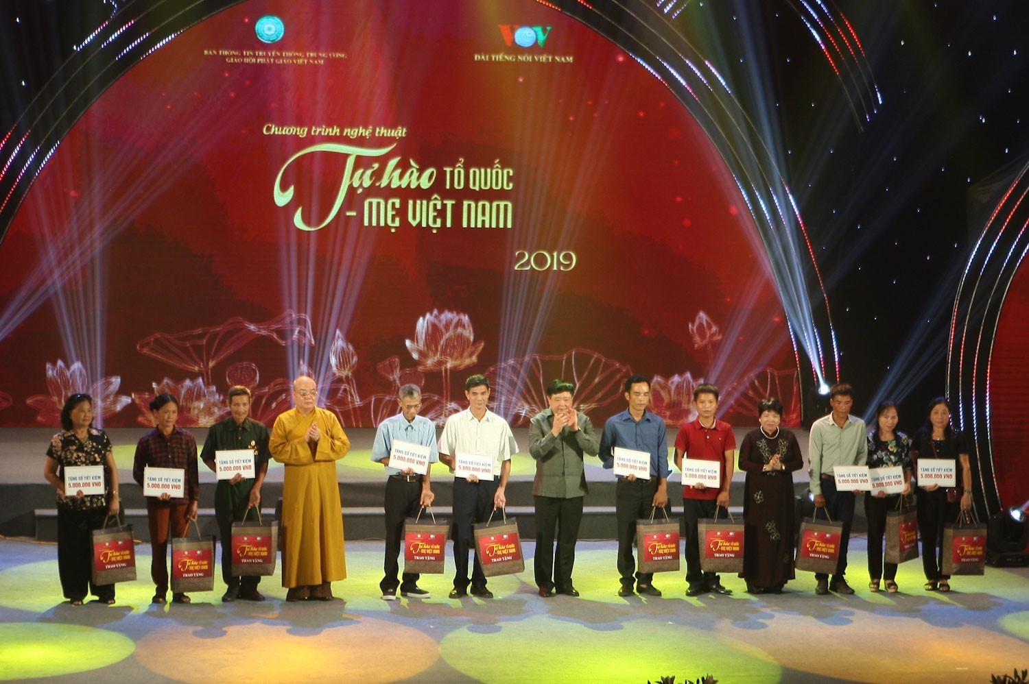 Tối 10/8/2019, tại Hà Nội, Ban Thông tin Truyền thông T.Ư Giáo hội Phật giáo Việt Nam đã tổ chức chương trình nghệ thuật đặc biệt “Tự hào Tổ quốc - Mẹ Việt Nam”. Nhân dịp này Ban tổ chức đã tặng quà và sổ tiết kiệm cho các thương binh và thân nhân gia đình liệt sĩ. Ảnh: Thanh Tùng/TTXVN