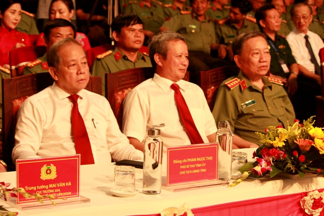 Bộ trưởng Tô Lâm, Bí thư Tỉnh ủy Lê Trường Lưu và Chủ tịch UBND tỉnh Phan Ngọc Thọ (từ phải qua) tham dự liên hoan