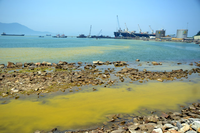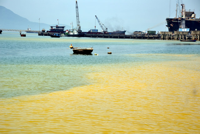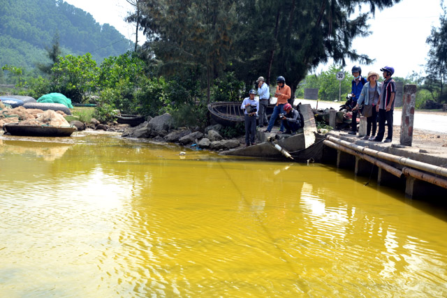 Theo đó, 10 giờ sáng nay tại đập tràn, sông Lạch Giang (thuộc thôn Phú Hải, cách cửa biển khoảng 500m) nước chảy qua đập có màu vàng đậm, mùi lạ. Khi đi ra biển, nhìn từ con đường vào cảng Chân Mây, trên biển có rất nhiều dải nước màu vàng nằm xen kẽ với nước màu xanh. Các khu vực gần bờ khác cũng ghi nhận nước màu vàng tương tự. Lấy nước đổ vào chai, khoảng nửa tiếng, phần màu vàng lắng đọng xuống đáy chai.