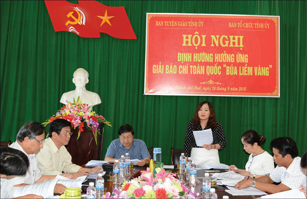 HNN - Chiều 28/9, Ban Tuyên giáo Tỉnh ủy, Ban Tổ chức Tỉnh ủy phối hợp tổ chức định hướng Giải báo chí toàn quốc về xây dựng Đảng với tên gọi: “Búa liềm vàng” trong đội ngũ lãnh đạo, phóng viên Báo Thừa Thiên Huế, Đài Phát thanh – Truyền hình tỉnh, Hội Nhà báo tỉnh, Sở Thông tin – Truyền thông.