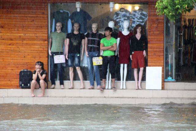 Một cửa hàng thời trang trên đường Bà Triệu bị ảnh hưởng bởi mưa ngập