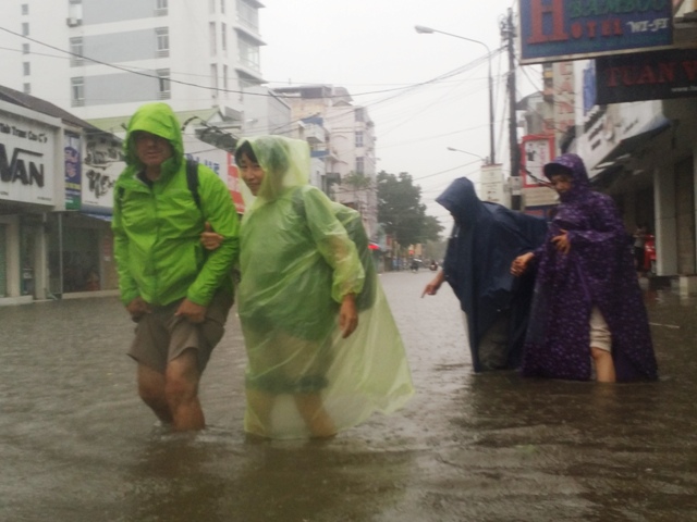 Một nhóm du khách lội lụt trên đường Hùng Vương
