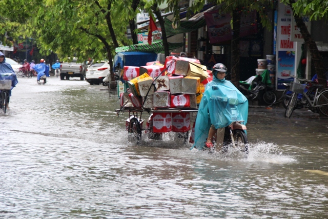 Cụ thể, tại một số tuyến đường như Hùng Vương, Bến Nghé, Lê Quý Đôn, Bà Triệu, Tôn Đức Thắng, Trường Chinh… nước mưa dồn ứ, không thoát kịp đã gây hiện tượng ngập cục bộ khiến các phương tiện lưu thông gặp khó khăn, nhiều xe bị tắt máy buộc phải dắt bộ. Theo ghi nhận, ở các điểm ngập này sâu từ 20-30cm, khiến việc buôn bán của người dân gặp nhiều khó khăn, hàng quán phải đóng cửa.