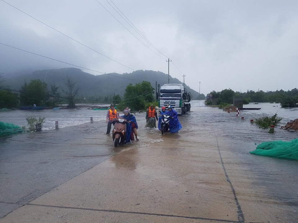 Lực lượng chức năng ở Lộc Vĩnh (Phú Lộc) hướng dẫn người dân qua những đoạn đường thấp trũng. Ảnh: Minh Tuệ
