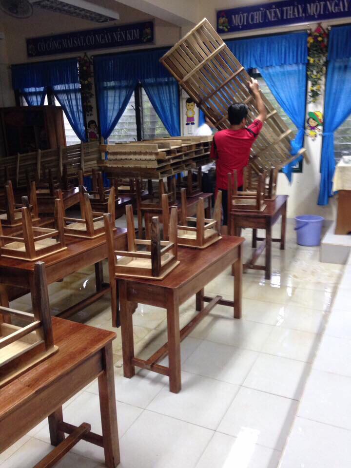 Giáo viên ở xã Lộc Trì đến trường dọn lũ lụt và kê bàn ghế. Ảnh: C.Hương