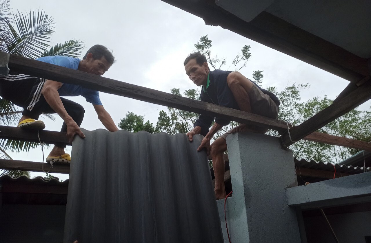 Người dân có nhà bị tốc mái tranh thủ trời tạnh lợp lại mái nhà