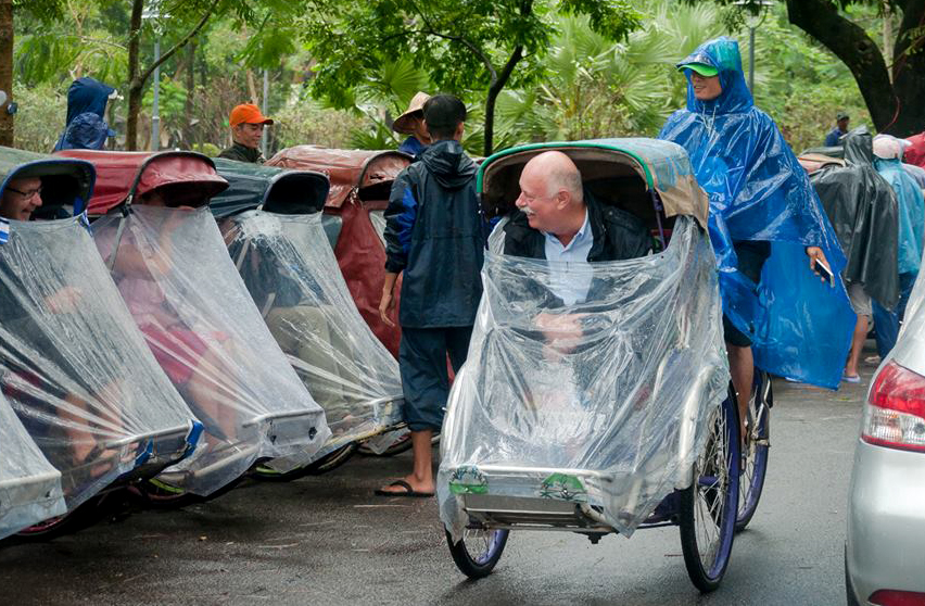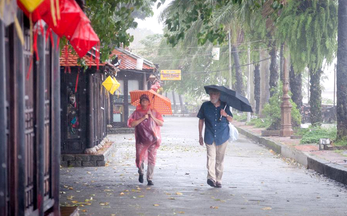 Hai vị khách người nước ngoài đi dạo dưới mưa Huế. Ảnh: Đ.Tuyên