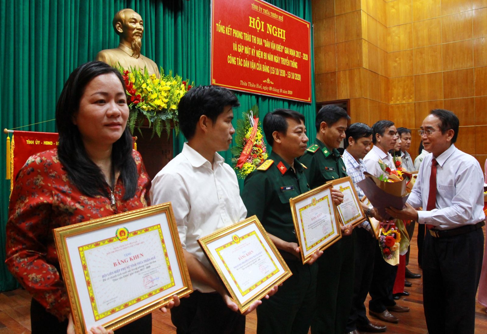 Tỉnh ủy, Ban Dân vận Tỉnh ủy đã trao 7 Kỷ niệm chương của Ban Dân vận Trung ương cho 7 cá nhân có nhiều đóng góp cho sự nghiệp dân vận của Đảng. Ban Thường vụ Tỉnh ủy tặng Bằng khen cho 19 tập thể, 3 cá nhân có thành tích xuất sắc trong phong trào thi đua “Dân vận khéo” giai đoạn 2017 - 2020.