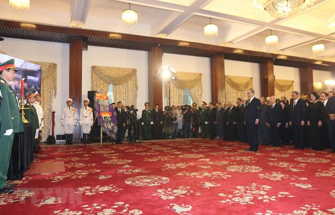 Đoàn lãnh đạo Thành phố Hồ Chí Minh do đồng chí Nguyễn Thiện Nhân, Ủy viên Bộ Chính trị, Bí thư Thành ủy Thành phố Hồ Chí Minh làm trưởng đoàn đến viếng nguyên Tổng Bí thư Đỗ Mười. (Ảnh: Thanh Vũ/TTXVN)