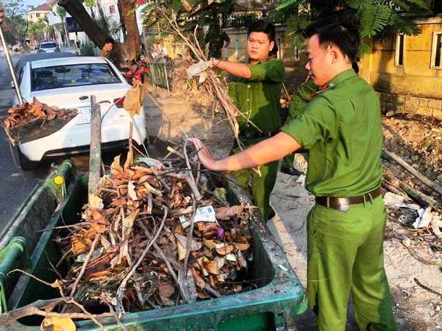 Lực lượng công an tham gia làm vệ sinh môi trường
