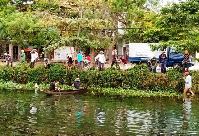 Người dân xã Quảng Thành (huyện Quảng Điền) tham gia vớt bèo và rác trên sông