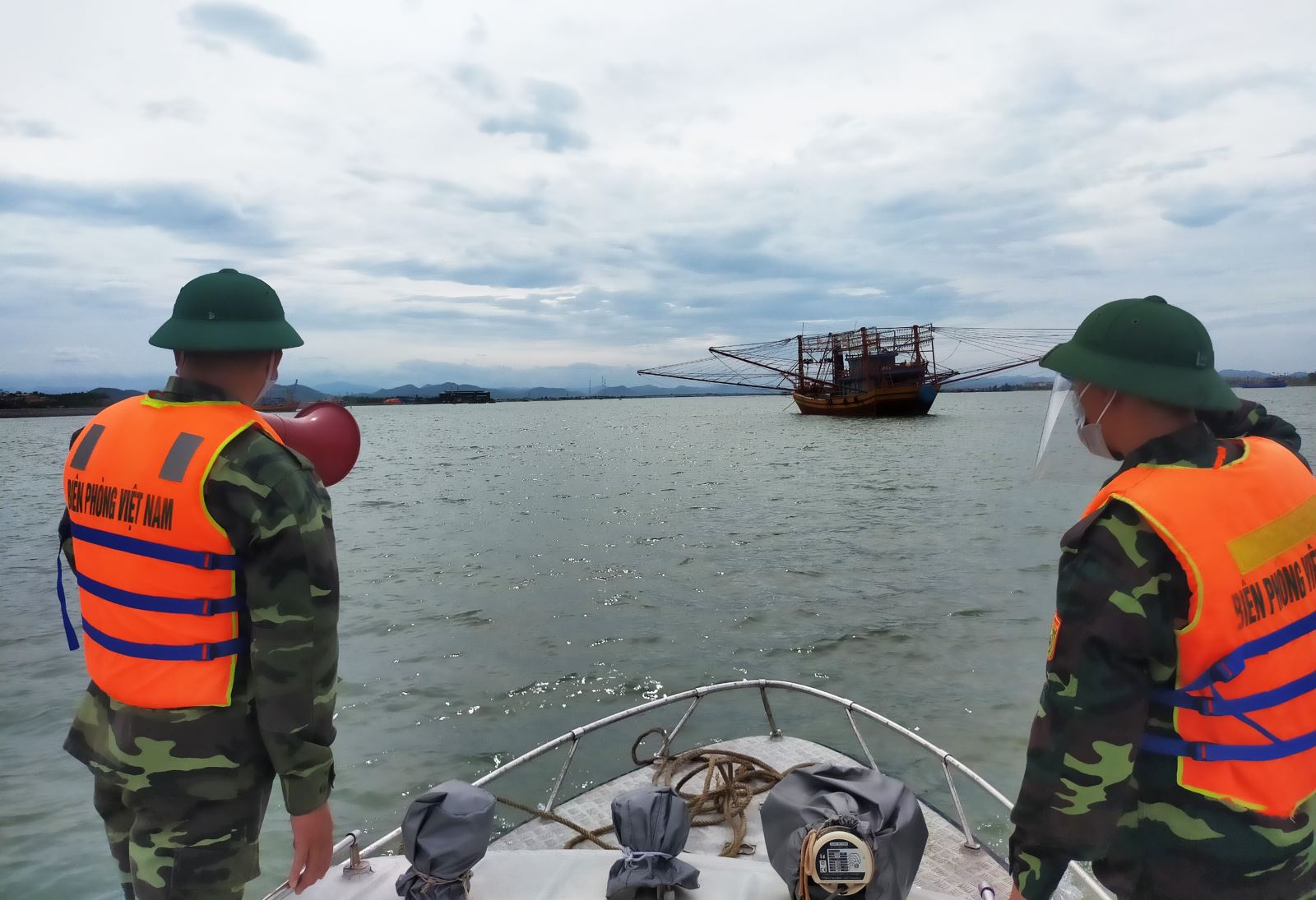 Cán bộ chiến sỹ Biên phòng Quảng Bình kêu gọi, hướng dẫn tàu, thuyền vào neo đậu tại bến thuyền, cảng cá đảm bảo an toàn. Ảnh: TTXVN phát