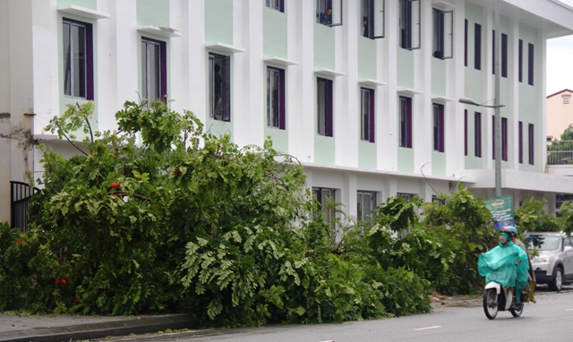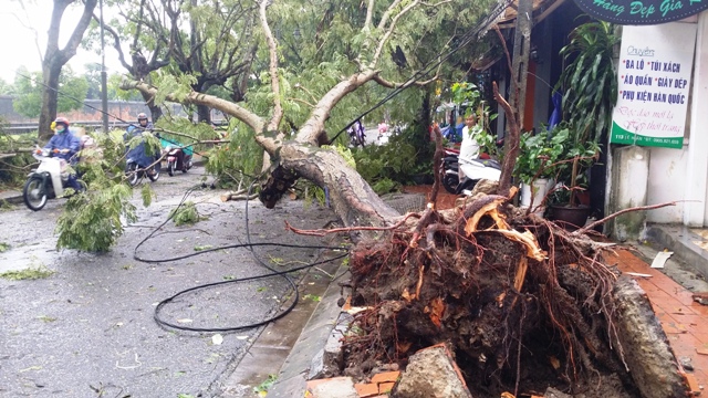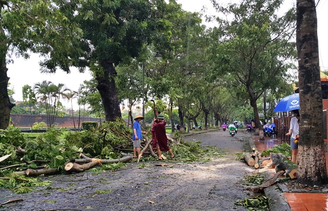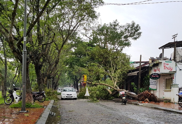 Ghi nhận của Báo Thừa Thiên Huế Online vào sáng 14/10 sau khi áp thấp nhiệt đới đi qua, tại nhiều tuyến đường trên địa bàn TP Huế như 23-8, Lý Thường Kiệt, Đống Đa, Lê Huân, Nguyễn Trãi…nhiều cây xanh gãy đổ, bật gốc hoàn toàn.