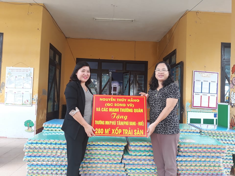 Các trận lũ lụt liên tiếp khiến Trường mầm non Phú Tân bị ngập lâu ngày, sàn lớp ẩm nặng, trước khó khăn đó, bà Bế Thị Kim Oanh, cựu giáo viên Trường THCS Vinh Xuân (Phú Vang) kết nối.các mạnh thường quân tại tỉnh Bắc Giang hỗ trợ cho trường gần 300 m2 xốp trải sàn.