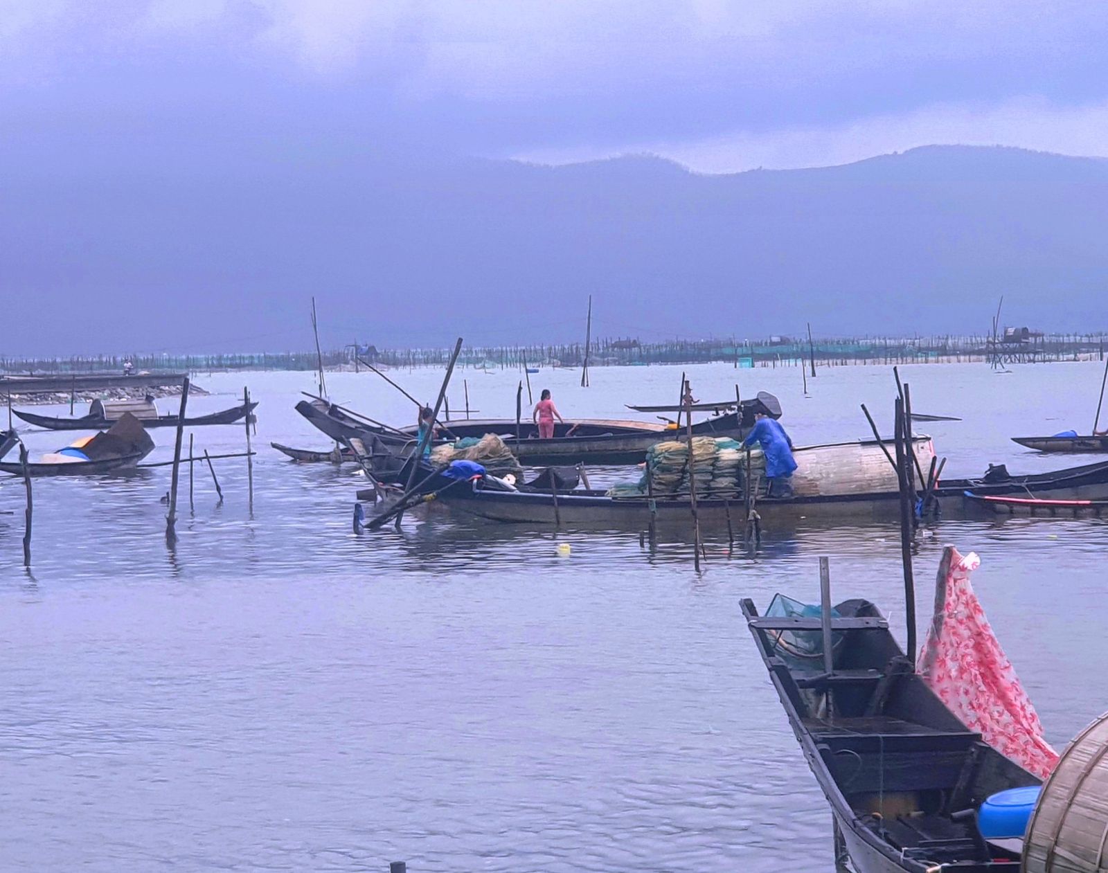 Nhiều ghe, gọ trên đầm phá của người dân Vinh Hiền bị chìm, gió đánh lật