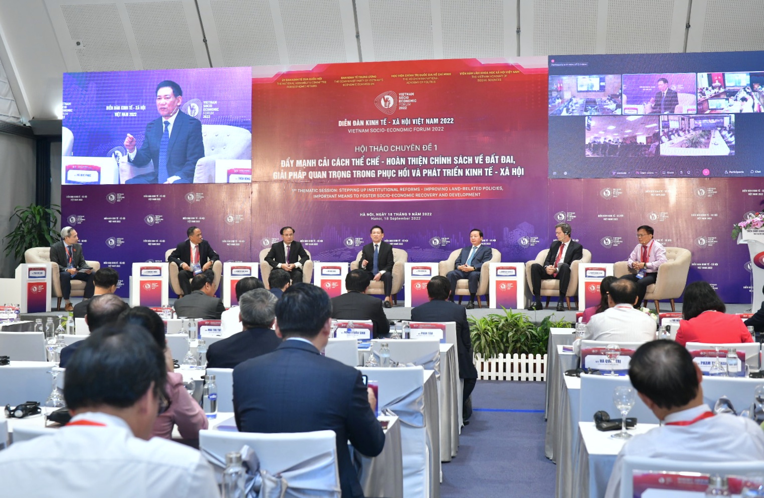 Các đồng chí lãnh đạo và chuyên gia kinh tế tham gia hội thảo bàn tròn tại Diễn đàn Kinh tế - Xã hội 2022.