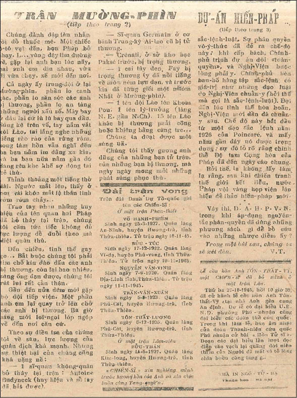 Dưới đây là danh sách Vệ Quốc Quân quê ở Thừa Thiên Huế, hy sinh tại các mặt trận từ cuối năm 1945 đến giữa đầu năm 1946 được đăng trên báo Chiến Sĩ. Do chiến tranh kéo dài, đất nước bị chia cắt làm hai miền, do nhiều nguyên nhân khác nhau nên có thể những người lính “Chết vì Tổ quốc” này chưa được công nhận liệt sĩ. Với hy vọng, sau khi nhật báo Thừa Thiên Huế công bố sẽ giúp được phần nào cho thân nhân của các Anh có cơ sở xác minh, làm thủ tục đề nghị Nhà nước công nhận Liệt sĩ để hương linh các Anh dưới chín suối mỉm cười.