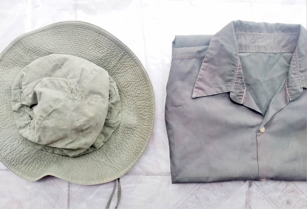 Áo và mũ tai bèo của chị Chế Thị Mừng (đội viên của Tiểu đội 11 cô gái sông Hương) mặc khi tham gia các trận đánh ở Sân Vận động, Lò Trâu, Sư Lỗ...