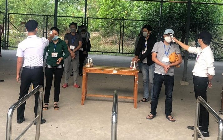 Đo thân nhiệt cho công nhân trước khi vào nhà máy sản xuất ở KCN Phong Điền. Ảnh: Như Quỳnh