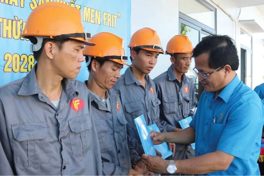 | Chủ tịch Liên đoàn Lao động tỉnh Lê Minh Nhân tặng quà cho công nhân lao động |