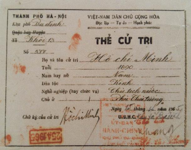 Tấm thẻ cử tri số 577, cấp ngày 15/4/1965 để bầu Hội đồng Nhân dân thành phố Hà Nội vào ngày 25/4/1965. Trên tấm thẻ cử tri này có hai điều đặc biệt, con dấu đóng ngày bầu cử bị ngược và chữ ký Hồ Chí Minh có nét cuối cùng kéo xuống. Để lý giải những điều đặc biệt ấy, đồng chí Vũ Kỳ (thư ký riêng của Người) đã kể lại: Đúng 6 giờ 30 phút, ngày chủ nhật, 25/4/1965, Bác Hồ đã đến điểm bầu cử tại quận Ba Đình (Hà Nội) để bỏ phiếu bầu Hội đồng Nhân dân thành phố. Đến nơi, Bác vui vẻ chào và nói với mọi người hãy cùng Bác làm tốt quyền lợi và nghĩa vụ của một người công dân.