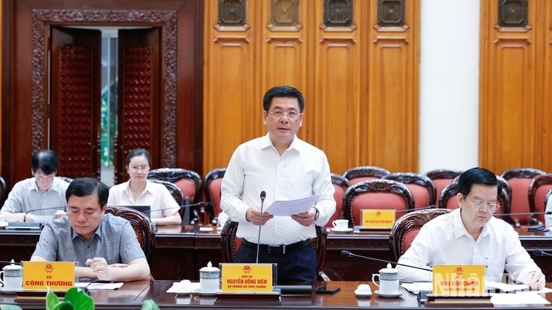 | Bộ trưởng Công thương Nguyễn Hồng Diên báo cáo tại cuộc họp (Ảnh: TRẦN HẢI). |