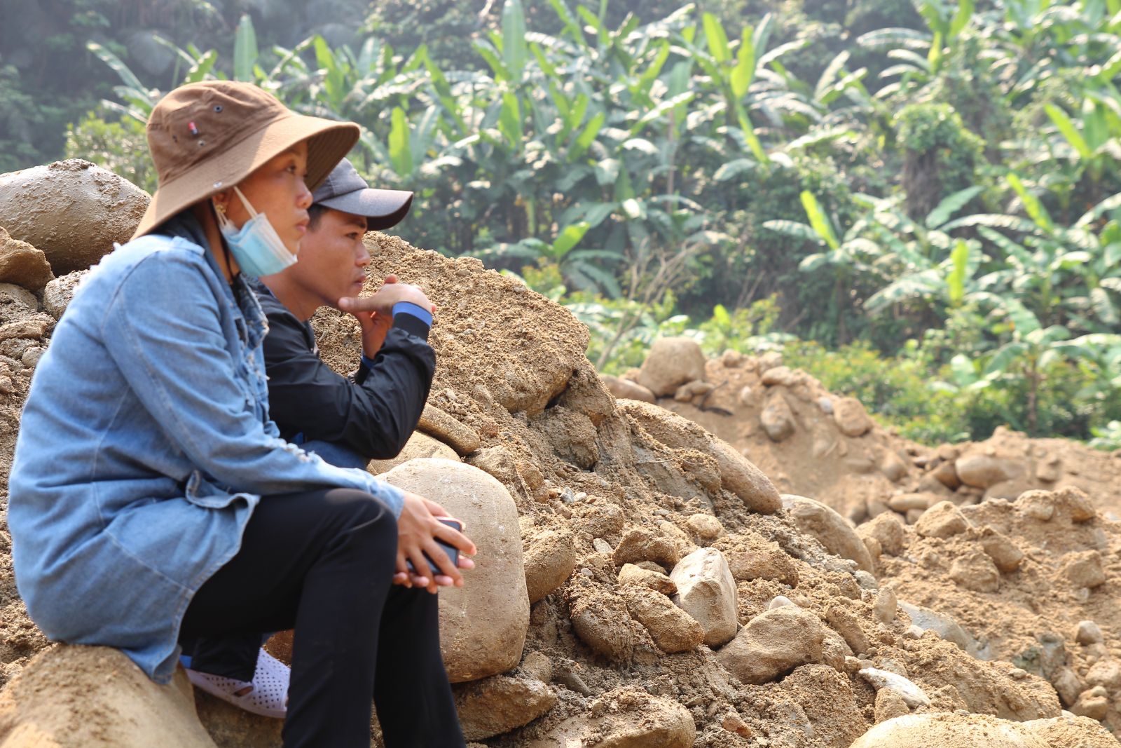 Chị Mai Thị Thu Thúy ngồi thẫn thờ chờ mong lực lượng chức năng sớm tìm được thi thể chồng
