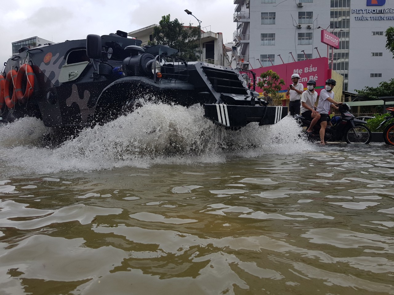 Xe của lực lượng quân đội làm nhiệm vụ trên đường phố trong những ngày mưa lũ