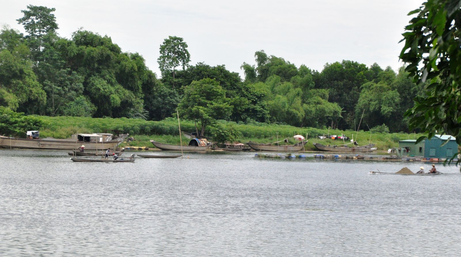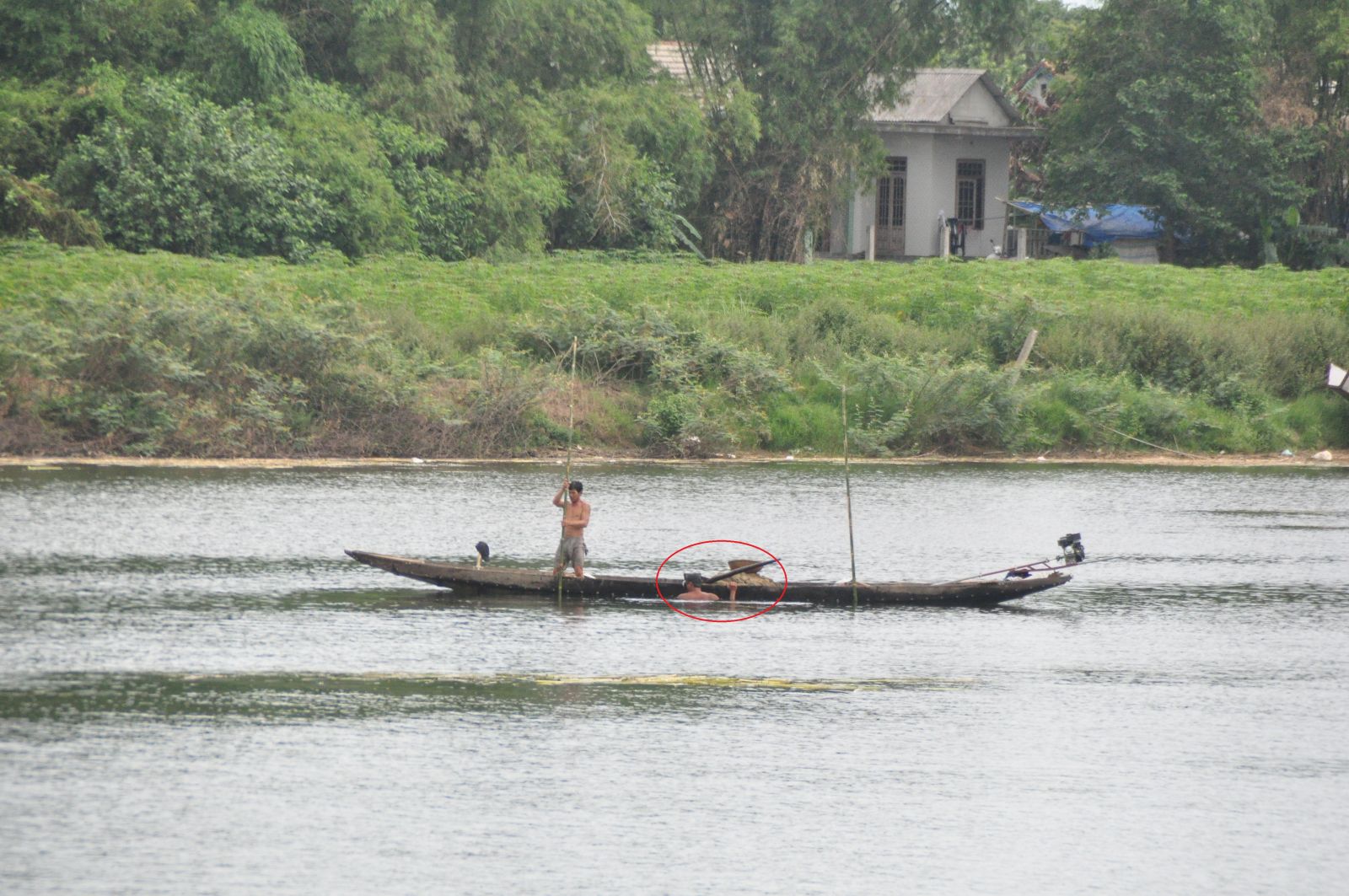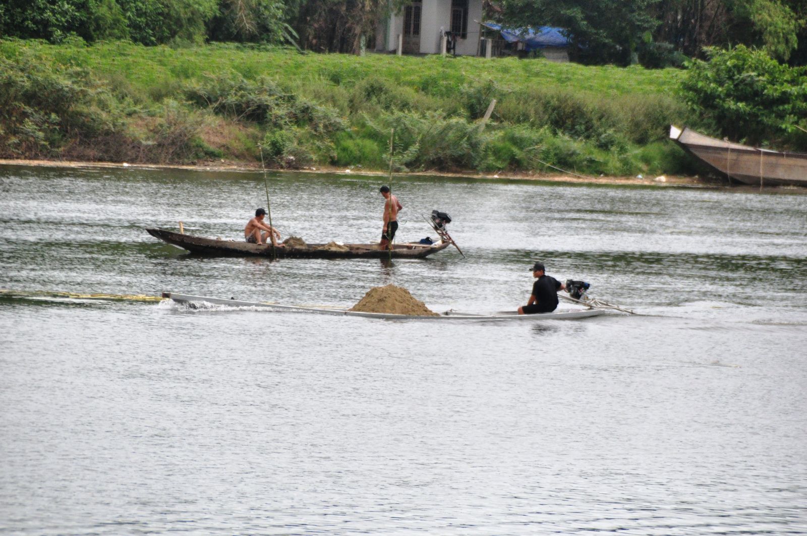 Nằm sát các lồng bè nuôi cá của các hộ dân, có 4-5 thuyền lớn nhỏ neo đậu sát bờ, dùng sào cố định thuyền lại. Các thuyền này ra gần bờ phía bên xã Quảng Phú, cứ 1 thuyền có 2 người, đánh trần trùng trục, ngụp lặn dùng thúng mủng xúc cát. Xúc hết vị trí này thì di chuyển thuyền đến vị trí khác, có lúc thuyền ra giữa sông, có lúc cặp sát bờ, nằm cạnh những diện tích đất nông nghiệp mà người dân ven bờ đang sản xuất.