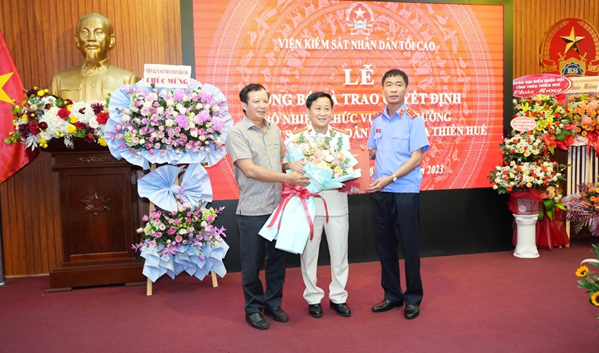 | Bí thư Tỉnh ủy Lê Trường Lưu và Phó Viện trưởng Viện Kiểm sát Nhân dân tối cao trao quyết định và hoa cho tân Viện trưởng Viện KSND tỉnh Hồ Thanh Hải |