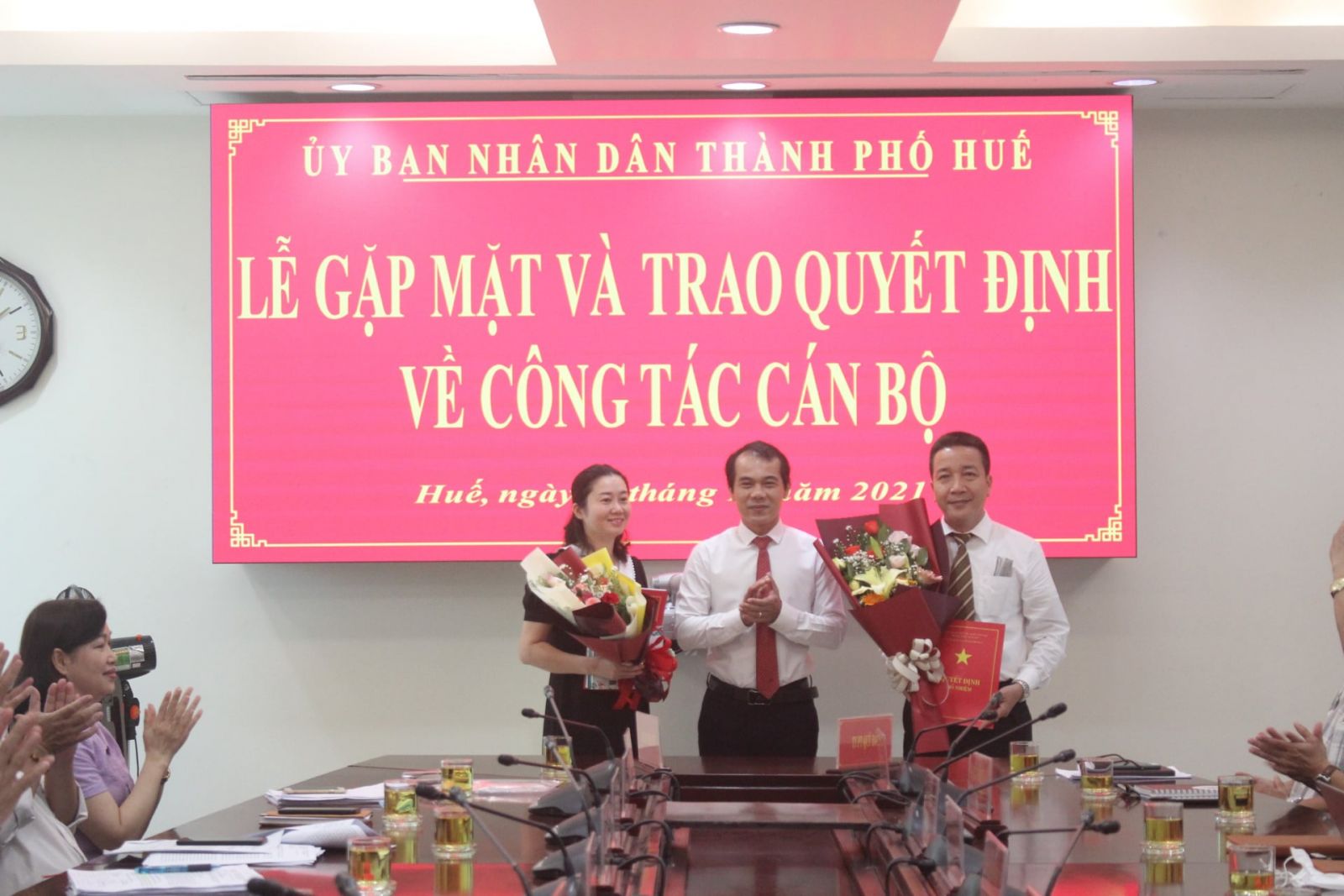Chủ tịch UBND TP. Huế Võ Lê Nhật trao Quyết định cho tặng hoa cho hai cán bộ