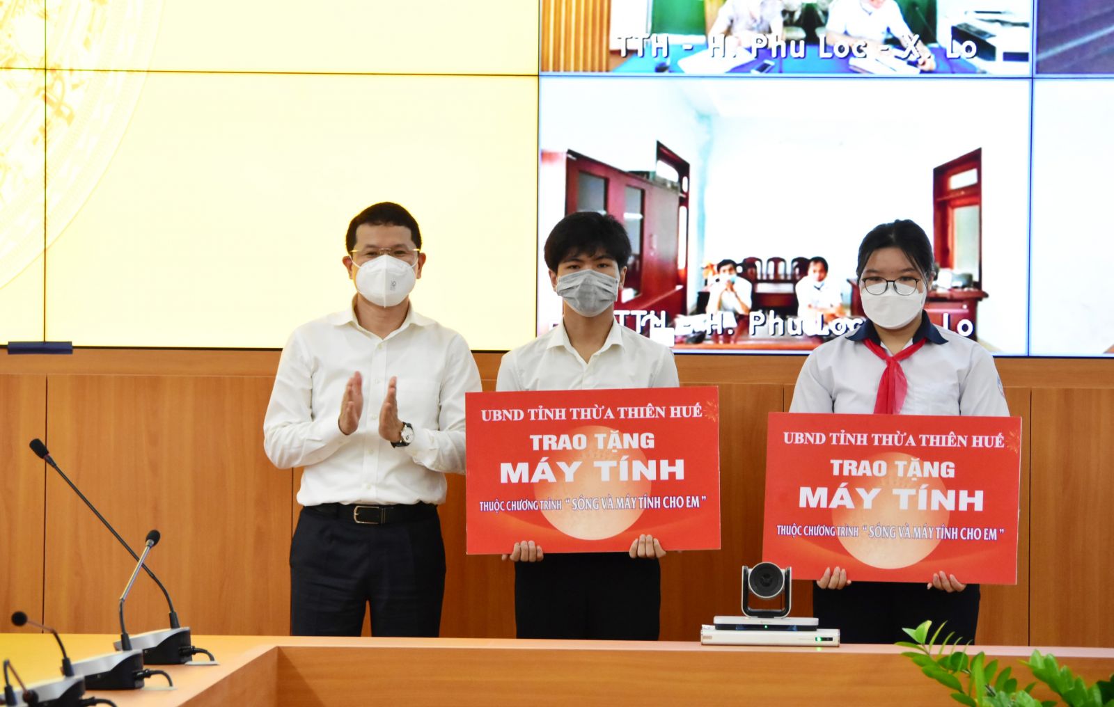 Tại chương trình, sau khi tiếp nhận hỗ trợ quà tặng của các doanh nghiệp, lãnh đạo tỉnh cũng đã trao tặng máy tính cho 2 em học sinh mồ côi bố mẹ do dại dịch COVID-19.