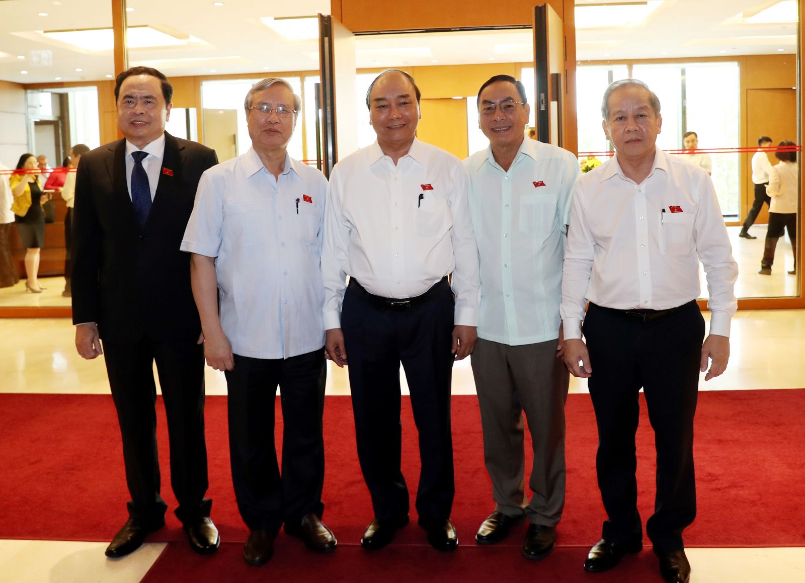 Trưởng đoàn ĐBQH tỉnh Phan Ngọc Thọ (bìa phải) cùng Thủ tướng Nguyễn Xuân Phúc và các đại biểu bên hành lang Quốc hội. Ảnh: Linh Trọng